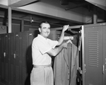 Lloyd Mangrum, pro golf's leading money winner in years since World War II, unpacks after arrival Tuesday for $25,000 Colonial Invitation meet.