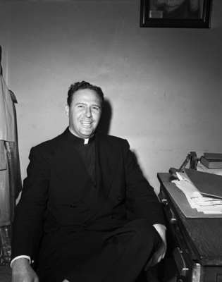 Reverend Robert Miller, CSB (Congregation a Sancto Basilio), member of the faculty of the University of St. Thomas at Houston. He gave pointers to the Laneri High School Booster Club on how to stage a successful Mardi Gras pageant and ball. Published in the morning edition April 24, 1950.