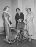 Mrs. Ernest Friedson, right, retiring president of the Fort Worth Pharmaceutical Auxiliary, Mrs. B. B. Daniel, center, project chairman, and Mrs. Hayden Hudson, left, treasurer of the Women's Board of the Fort Worth Children's Hospital, examine the junior size wheelchair the auxiliary has presented the hospital.