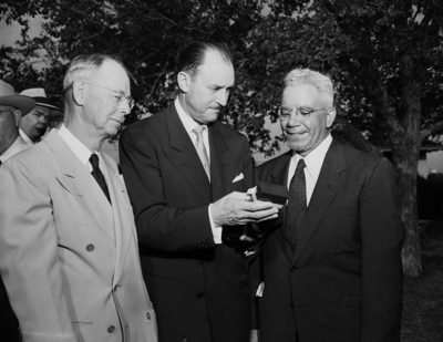 Eugene Butler of Dallas, left, editor of Progressive Farmer, and Dr. E. B. Evans, right, president of Praise View A&M College, were awarded the Hoblitzelle Awards for Advancement of Texas Rural Life at Renner . With them is George L. MacGregor, trustee of the Texas Research Foundation, which observed its annual field day at Renner.