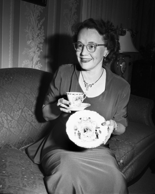 Mrs. Elizabeth Priest with one of her collection of cups and saucers.