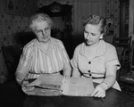 Mrs. Larry Kittle, left, Comanche County's first home demonstration agent, shows some old clippings on extension work to Miss Dorothy Jean Carlson, present home demonstration agent for the county.