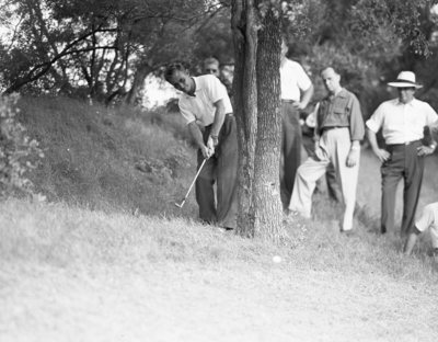 Earl Stewart chips from behind a tree to the 16th green in Thursday's first-round Colonial play. He two-putted for a bogey 4.