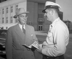 J. Allen Rhodes, left, vice president of First National Bank of Fort Worth, receives from C. K. Hawley, accident investigation officer, one of the pamphlets urging traffic safety which were distributed to passerby on the city's downtown streets Thursday by police offices. The pamphlets are part of the campaign conducted by the Fort Worth Safety Council, the New Car Dealers Association and the Fort Worth Service Station Association.