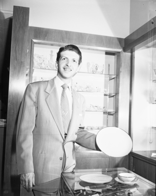 Nat Cohen, assistant manager at Kruger's Jewelry at 614 Houston, displays some of the Francisca china featured at the new store.