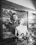 Pat Garrett shows watches on display at Kruger's Jewelry as Bob Portteus opens shelves featuring tea service and other silver.