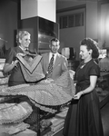 Mrs. W. J. Midgett, left, and Hyman Glickman show Mrs. Iva green one of the dresses in Margo's lines