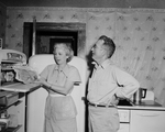 Mrs. J. E. Smith shows Eastland County Agent J. M. Cooper some delicious turkey steaks which are a regular item on the Smith dining table.