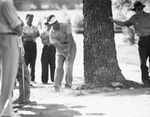 Fred Hawkins of El Paso makes good recovery from behind tree to reach No. 10 green after overshooting. He took 77 Friday for 148, eight strokes off the place in Colonial National Invitation golf tournament.