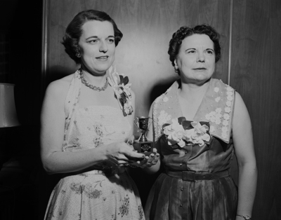 Mrs. Lucile Trent Kelly, left, retiring president of Trinity chapter, National Secretaries Association, accepts a cup in behalf of her boss, C. S. Edmonds, freight traffic manager of Fort Worth and Denver Railroad. Edmonds was declared "Boss of the year" by the chapter Friday. Making the presentation is Miss Grada Lee Johnson, president-elect.