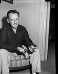 Reverend H. Guy Moore, back from a tour of Southern Baptist mission fields in Africa and the Middle East, holds two ancient Arabian shepherds' knives, which he brought back for souvenirs for his sons.