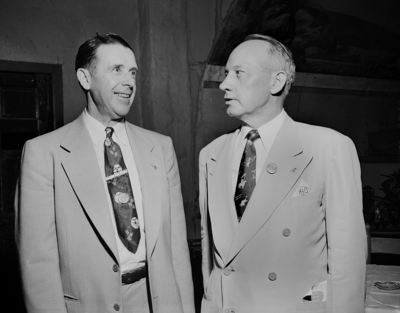 W. F. Rankim, left, and S. P. Copeland, who received emblems for 30 years of service. Both are in the Fort Worth headquarters of the Gulf's Fort Worth production division.