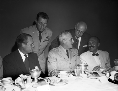 Fort Worth dignitaries chatted with Air Force Chief of Staff-designate General Nathan F. Twining before the general's speech in Dallas. Left to right are George W. Armstrong Jr. president of the Fort Worth Chamber of Commerce, Brig. General Joe W. Kelly, commander of the 19th Air Division, Carswell Air Force Base; General Twining, Fort Worth Mayor Edgar Deen and Ralph G. Platt of Cleveland, president of the Aviation Writers Association whose convention the general addressed.