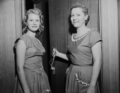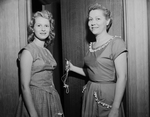 Mrs. Gene May and her 16-year old daughter, Ruby display the Venetian blind cord that three armed robbers used to keep them in the bathroom of their own home after escaping with $6,620 in cash and jewels. Two other May children and three friends also were held captive.
