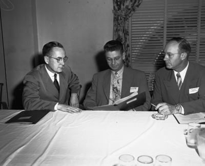Studying the agenda of the Natural Gasoline Association of America convention at Hotel Texas are these directors. Left to right: Phil Naker, Carter Oil Company, Tulsa; Allen Givens, Coltexo Corporation, Monroe, La., and Earl Nutter, Panama Corporation, Amarillo.