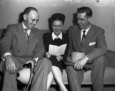 Mrs. Toni Coman, staff member, points out interesting papers on the Natural Gasoline Association of America program to J. M. House, left, Cabot Carbon Company, Kermit, and Rob D. Trimble, right, chairman, Carthage Field Engineering Committee, Carthage, who are attending the 29th annual NGAA convention at Hotel Texas.