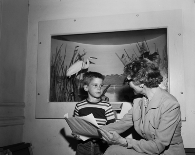 Six-year-old Victor Caster, son of Mr. and Mrs. W. M. Caster, shows his life membership to the Fort Worth Children's Museum to Mrs. Ann Webb. The youngster won the certificate Saturday for his outstanding work in nature study this year.