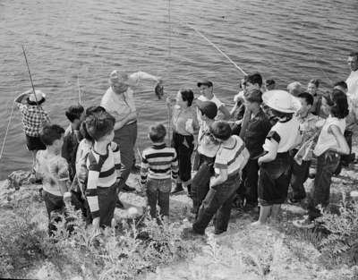 Dianne Gilmartin, 10, was slightly amazed at the big sun perch she hooked at the annual fishing rodeo at White Lake and had call on Homer Davis, a Jaycee, to help pull it in. Davis holds it for her to admire.