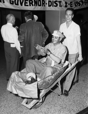 Bob spellings, treasurer of the Riverside Lions Club in Fort Worth, rides in a wheelbarrow powered by his club president, Grady Clark.