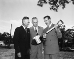 Reverend G. Alfrod Brown, right, superintendent of the Fort Worth Methodist district, holds the shovel which turned the first dirt for a new $25,000 Handley Methodist Church at Forrest and Routt. With him are Reverend Fred Benkley, pastor, left, and J. N. Patterson, chairman of the building committee.