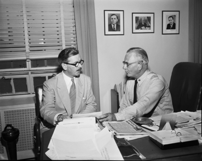 Dr. J. Gordon Mathias, left, London psychiatrist, discusses mutual psychiatric problems with Dr. R. B. Holt, medical officer in charge of the U. S. Public Health Service Hospital here, on a tour last week.
