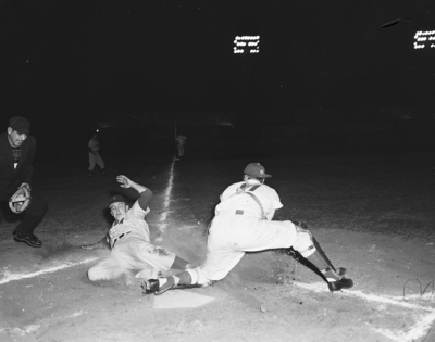 Ed Bailey, Tulsa catcher, slides home safely in second inning of Tuesday night game with Fort Worth after single to right by Joe Torpey. Al Ronning is Cat catcher. Cats won, 8-3.