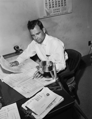 Jack C. Moore, policeman who had polio, is sitting at desk.