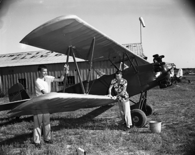 This early-day product of Convair, Fleet Model 2, is still airworthy. Its owners, A/2C Dale K. Williard, left, and A/10 William R. Davis, given the 1929 plane a bath at Midwest Airport.