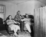 Mr. (right) and Mrs. Fred Smith (left) and Freddie (center) are shown watching a television program in their attractive living room. Mr. Smith has a dairy farm in Justin, Texas.