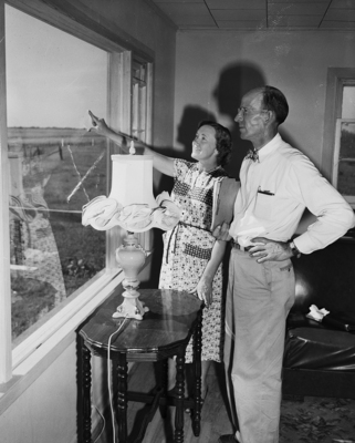 Mrs. Fred Smith and Pat Roberts, Farmers Home Administration supervisor in Denton County, stand at the picture window in the newly remodeled Smith farm home. The Smith family own a dairy farm in Justin, Texas.