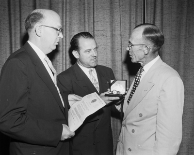 Chester C. Heitman, right, retiring credit manager of Armor and Company, received a watch, presented by Dennis Hall, center, and honorary life membership, presented by J. Harris (Pat) Murphy, at "Heitman Night" dinner of Fort Worth Association of Credit Men at Hilton Hotel.