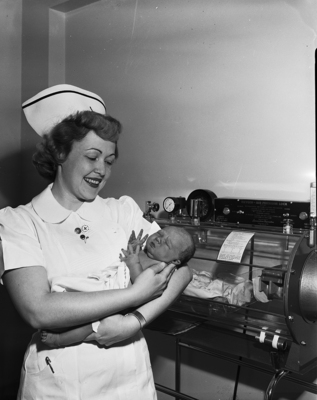 Mrs. Billie Stoker, nurse, is holding unidentified baby found in the car of Harry Bell Jr..