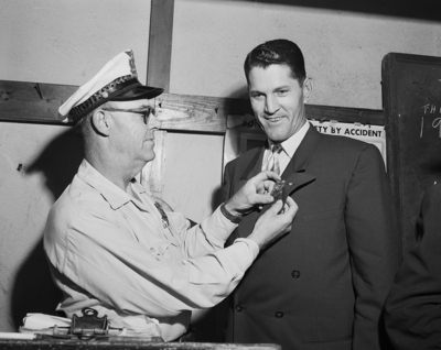 Police Chief Cato Hightower, right, received a badge to match the office from Traffic Officer C. E. Neal in a presentation ceremony during shift changing Wednesday afternoon. The badge, gold with the star centered with a diamond, was bought and presented to the new chief by all members of the department.