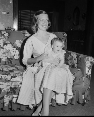Mrs. John H. Wilson II, and her 5-month-old daughter, Cathy, are sitting on a sofa. They are visiting Mr. and Mrs. John H. Wilson.