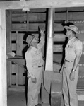 Tony Walterscheid and Emmitt Yoder, Soil Conservation technician, inspect the feed grinder and conveyor pipes in the Walterscheid labor-saving farm setup near Muenster.
