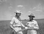 Tony Waltersheid and Emmitt Yoder look at oats and clover grown in combination on Walterscheid's farm.