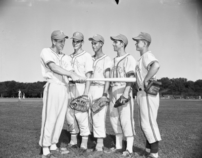 Poly Outfielder Bennett Williams, who's carrying.448 average, talks hitting with four sophomore teammates. Left to right, Williams, Catcher Hunter Enis, Outfielders Robert Groom and I. B. Childs and Shortstop Joe Selman. Poly will play in state baseball tournament at Austin next week.