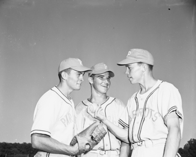 Richard Hoyler, left, and Bob Wilson listen intently as Second Baseman Woody Woodman as he spins yarn during Poly practice session for state baseball tournament in Austin this week. Both Hoyler and Woodman are all-district selections.