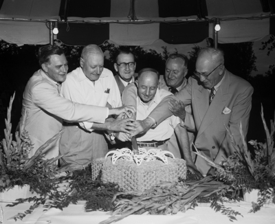 Exchange club members celebrated their 30th anniversary with this cake-cutting ceremony at the Eagle Mountain Lake Lodge of Mr. and Mrs. Kenneth W. Davis. Joining in the slicing, left to right, are Harry Brants, William Rigg, Tom Mastin, George W. Saam, Scott Teel and J. Lee Johnson Jr..