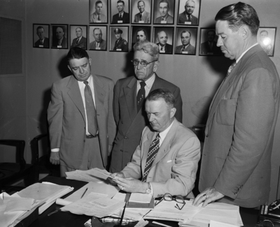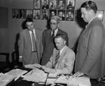 Receiving funds for tornado victims at San Angelo. Left to right, M. D. Fanning, Claude Meadows Jr. Robert B. Carr and Otis Stewart.