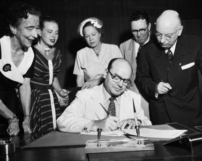 Frank Kent, seated, signs a contract making him Cadillac dealer for the Fort Worth area. With him, left to right, are Mrs. Kent, Mrs. W. B. Waynock, their daughter, Mrs T. R. Finley and her husband, a Dallas Cadillac official,and E. F. Upson of Detroit, sales manager for Cadillac.