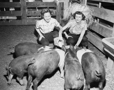 Calls for Chow from Mrs. Mary Folster, left, and Miss Annie Newsome, employees at Southwestern Bell telephone Company, get a response from several of the 200 pigs that will be sent by organized labor here through the Christian Rural Overseas Programs to farm boys in Honduras. The pigs are quartered in a cattle barn at Will Rogers Memorial Coliseum.