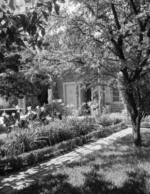 A basket weave brick walk leads to the studio, where Mrs. McKnight carries out her garden club affairs.