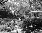 Standing in one of the arcs formed by the western boundary hedge, Mrs. Alfred McKnight Jr., offers a chair to a visitor.