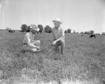 Henry Turney, range conservationist for the Soil Conservation Service with the Dublin SCS office which works with the Upper Leon Soil Conservation District, looks over a field of hairy vetch and speltz with N. O. Keith. Published in the Fort Worth morning edition, May 7, 1950.