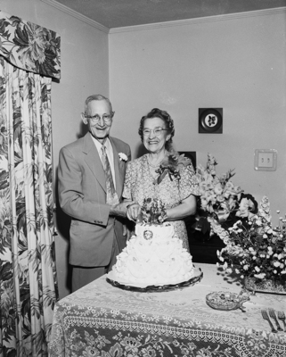 Mr. and Mrs. B. F. Ziegler celebrate their 50th anniversary. He holds her hand and cutting their cake.