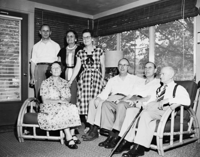 T. H. Mueller and group sitting on sunporch (individuals not identified but Mueller).