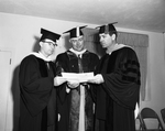President Law Stone of Texas Wesleyan College, right, instructs Reverend L. Eugene Harris, left, and Land Commissioner Bascom Giles where they will appear on the graduation program. Reverend Mr. Harris and Giles received honorary doctorates from TWC.