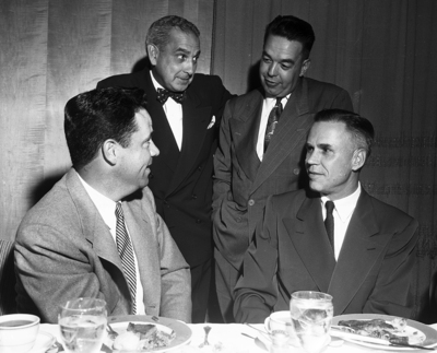 Chamber of commerce dinner honoring Convair on its 30th anniversary. Flying in from Convair's San Diego headquarters for banquet at Hotel Texas celebrating the company's 30th anniversay were left to right, Thomas G. Lanphier Jr., Jack V. Naish, W. C. Rockefeller and R. C. Sebold, all op executives of the company.