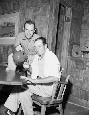 Top amateurs compete in the National Open at Colonial. Ernie Vossler, left, low amateur in qualifying Monday, offers cool drink of water to Ray Gafford in clubhouse after latter fired 136 to lead field in bid for Open berths.